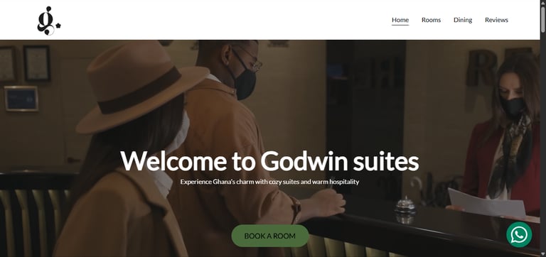 Godwin Suites is a demo hotel website I built to showcase what a professional hospitality business can look like online. The project features a full room catalog, a dining page, guest reviews page, and direct WhatsApp booking integration.